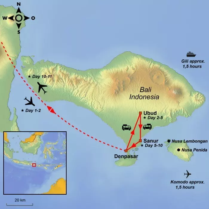 The tour starts in the charming and enchanting artists’ town of Ubud, scenically situated in the highlands of Bali, surrounded by grass-green rice fields, rivers and sacred temples. Ubud is also the cultural heart of Bali, where ceremonial events and traditions are observed with soul. The days are at your disposal, and you can pick and from a number of exciting optional tours.