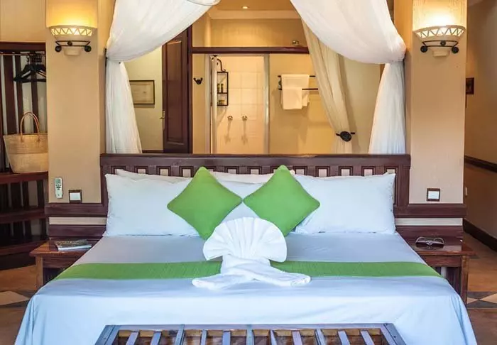 The spacious, modernly appointed rooms all have mosquito nets around the beds, air conditioning and tea and coffee making facilities.