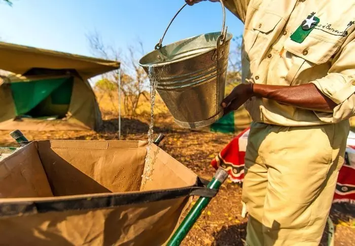 Outside the tent, there is a small shady canopy with chairs, so that you can enjoy the view of the nature around you. You sleep on a comfortable folding bed with a nice soft mattress, real duvets and pillows and a small bedside table. In direct extension of your tent, you have your own bush bathroom with shower and toilet. The tent does not have electricity or running water, and the flushing function of the toilet consists of a pile of soil and a small shovel – but there IS a toilet! Several times a day, you are supplied with hot water, and you can wash yourself in a small basin placed in a rack outside the tent. If you have seen the movie ‘Out of Africa’, you know exactly how it works. In the afternoon, water is heated and hoisted up into a bucket with a shower head underneath, so that you can have your nice hot shower. It is primitive, but comfortable, and most importantly: it is overnight accommodation on nature’s own terms, where you leave no traces while you get up close to the delta’s wildlife.
