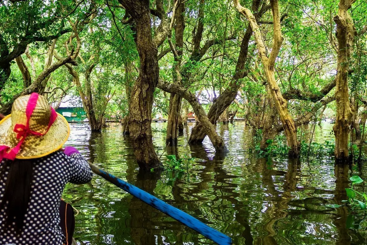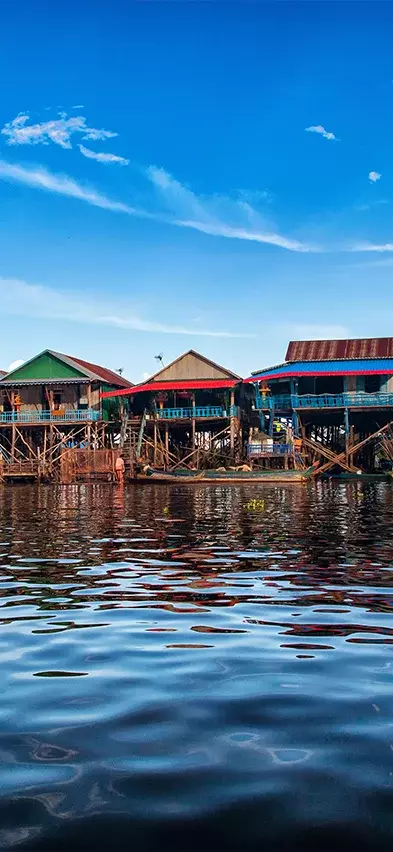 You arrive on the shore of Tonle Sap Lake and board a boat that will take you to the floating village of Kompong Phluk. Here, you get right up close to what life is like for the many families who primarily live off fishing. The families live along the banks of the lake in colourful houses that stand on long stilts, allowing them to cope with the high water level in the rainy season, when the narrow streets in the village turn into small canals. In the dry season, when the water level is low, the tall stilts are in full view.
