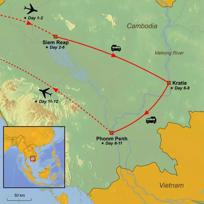 Experience the unique attraction of Angkor Wat, lush landscapes along the Mekong River, rare Mekong dolphins at Kratie and the lively capital of Phnom Penh. Extend the tour with a beach holiday.