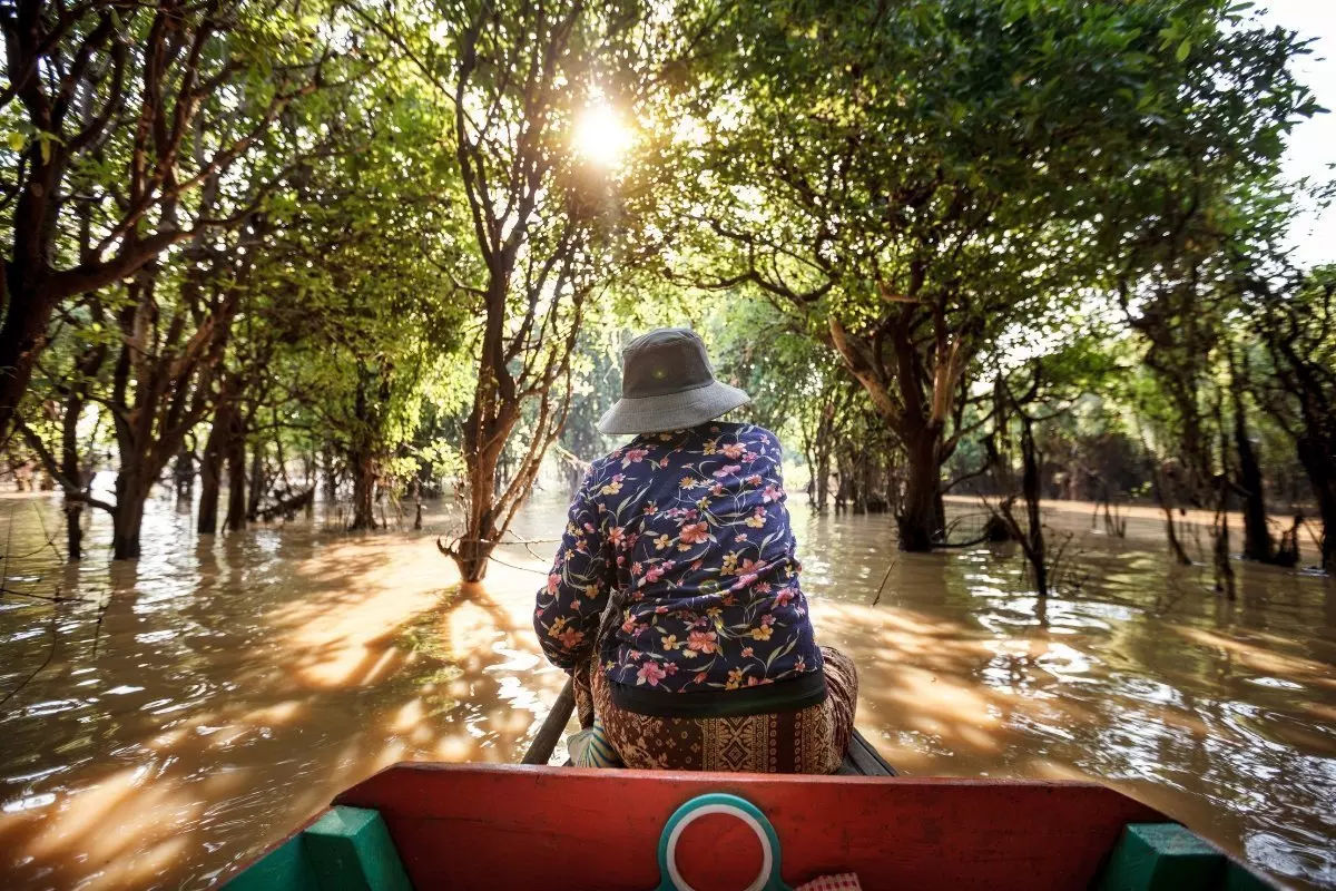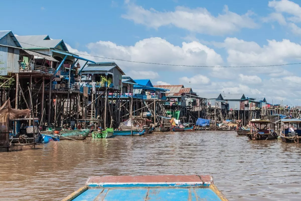 Here, you board a boat and are sailed to one of the many fishing villages, Kompong Phluk. Hear what life is like for the many families who primarily make a living from fishing. The families live in characteristic colourful houses built on long stilts, allowing them to cope with the high water level in the rainy season, when the narrow streets in the village are transformed into small canals. In the dry season, when the water level is low, the long stilts are in full view.