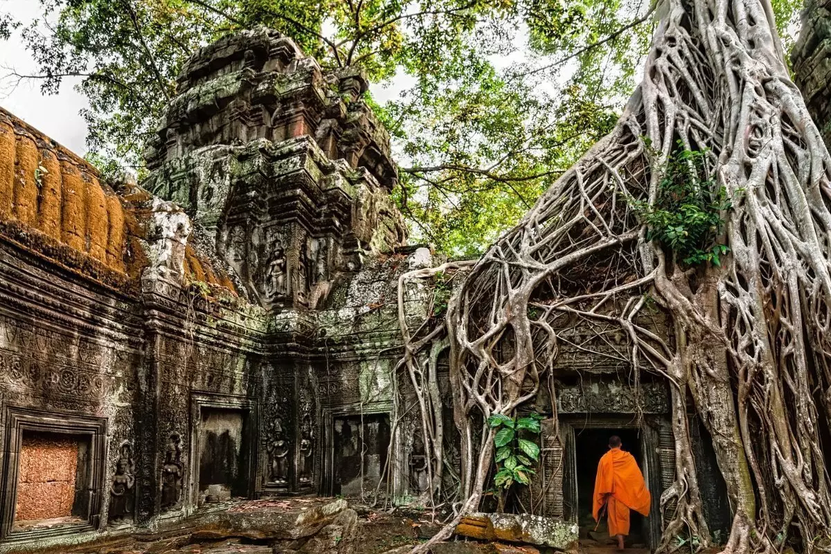 Finally, you visit the famous Ta Prohm temple, made unique by the beautiful, large trees that have taken root in the temple buildings, becoming as one.