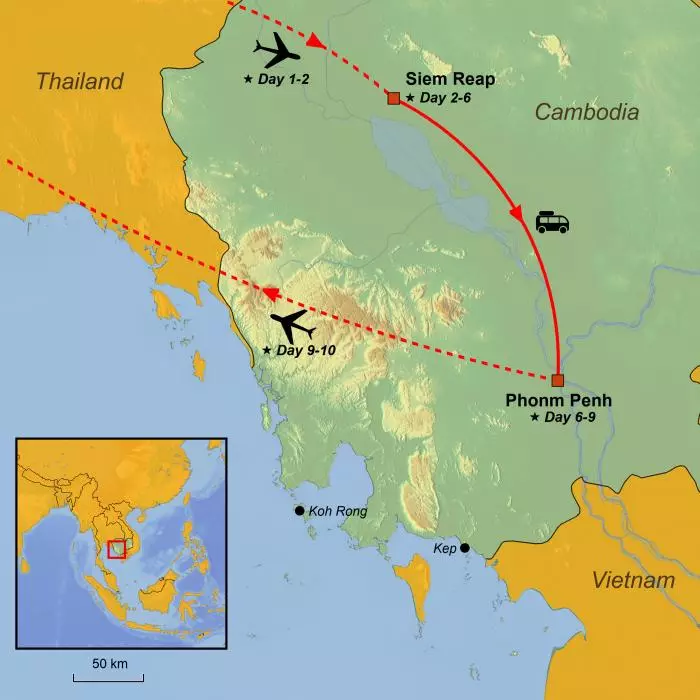 The extension includes a 3-night beach holiday at the resort with breakfast and transfers between Phnom Penh and the resort in Kep. Note: If your tour ends in Siem Reap, the extension also includes a domestic flight from Siem Reap to Phnom Penh.