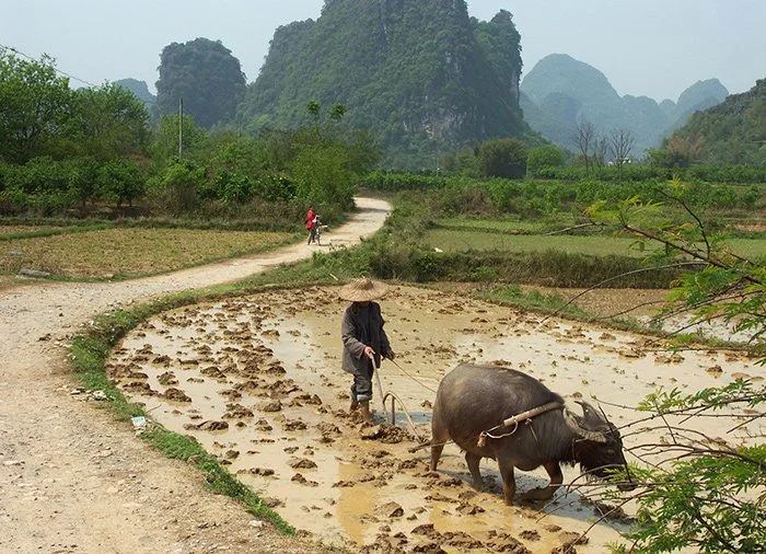 You cycle along the Yulong River, a tributary of the great Li River, which flows from Guilin to Yangshuo. The ride takes you past rice fields, vegetable fields and through charming little village communities, providing insight into the everyday lives of the farmers. Along the roads, there are a couple of local women selling lovely, handmade flower wreaths, while industrious men work in the fields. You might even be lucky enough to see them ploughing with the help of a water buffalo.