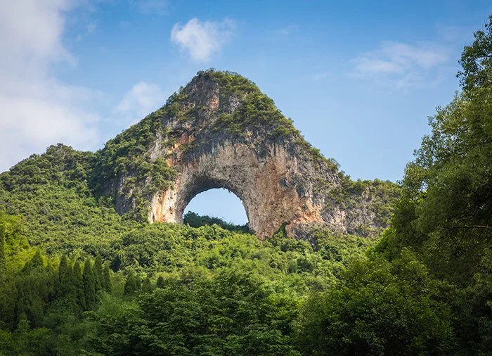 At lunchtime, you arrive at one of Yangshuo’s highlights: the distinctive rock Moon Hill, named after its moon-shaped hole at the top.
