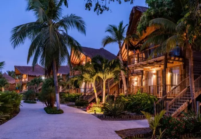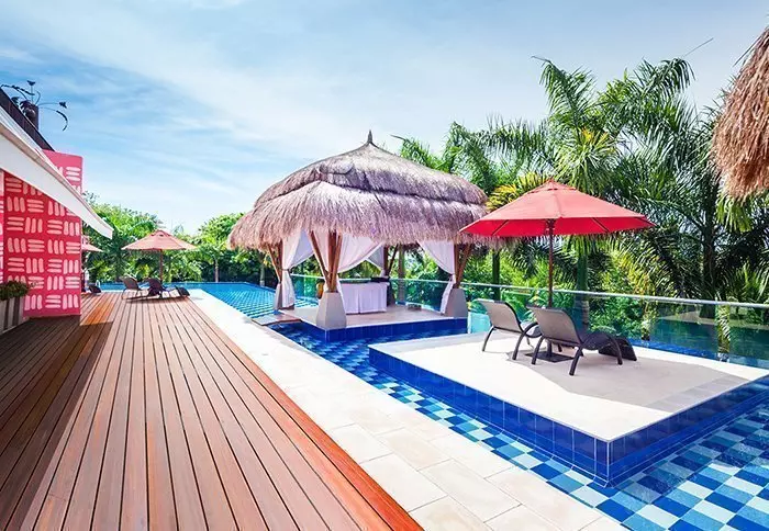 Nestled in a tropical garden surrounded by palm trees and mangrove forest, the hotel boasts its own private beach, offering the joy of waking up to turquoise waters and the gentle sound of waves lapping at the shore.