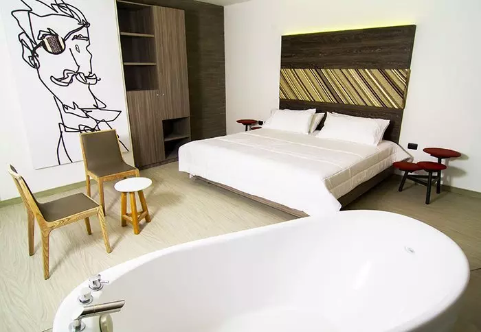 The hotel has just 9 rooms, all with modern, unique interiors. All rooms have an en suite bathroom, cable TV, a safe and air conditioning. There is free Wi-Fi throughout the hotel.