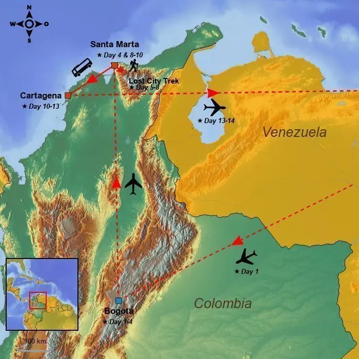 Today marks the commencement of your trek to the Lost City. Channel your inner Indiana Jones, as this adventure is akin to a mini-expedition through the lush jungles of the Sierra Nevada Mountains. Spanning about 50 km, the trek lasts four days, traversing terrains with high temperatures and humidity. Overnight stays are in basic camps along the way. Your skilled guide will lead you and your group to the impressive ruins of Ciudad Perdida, better known as the Lost City. We assure you that while the trek is challenging, it is entirely worth the effort and may become your fondest memory from your tour in Colombia.