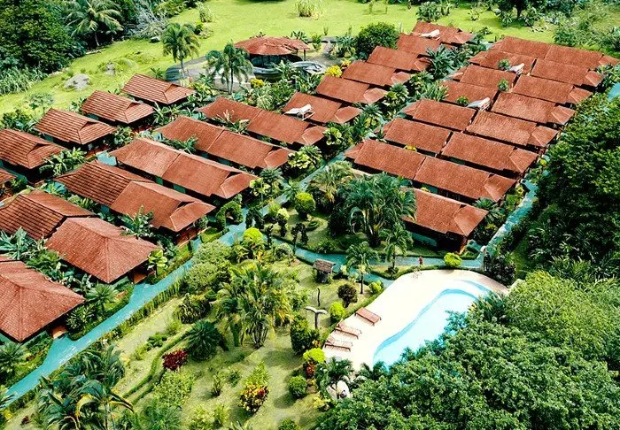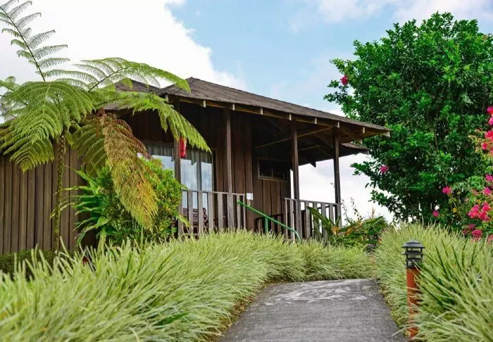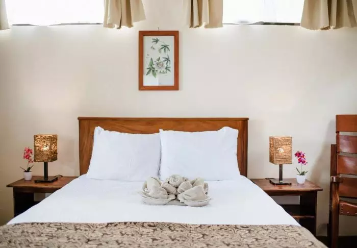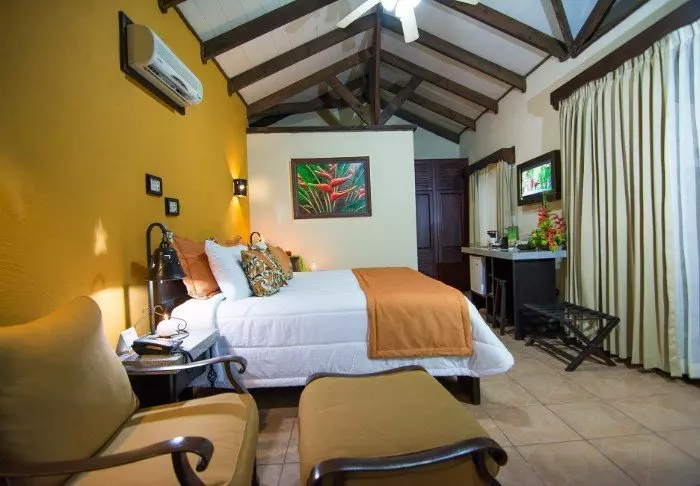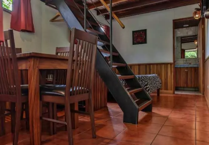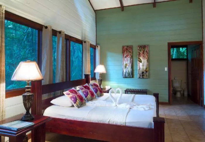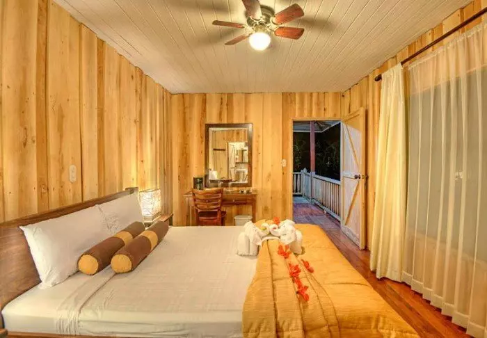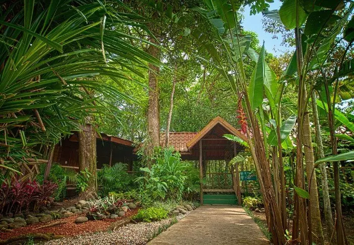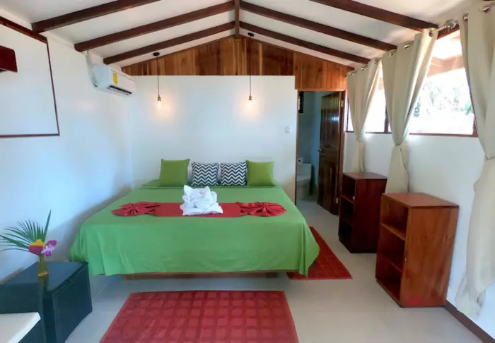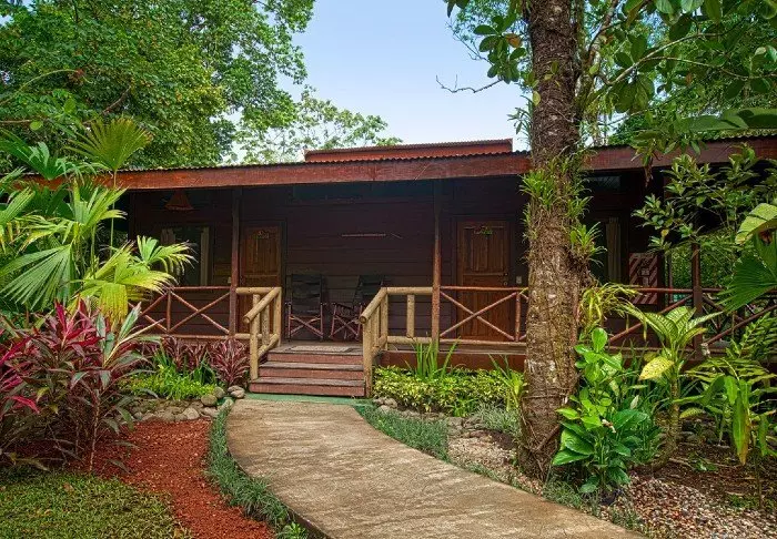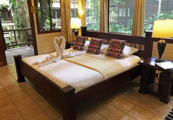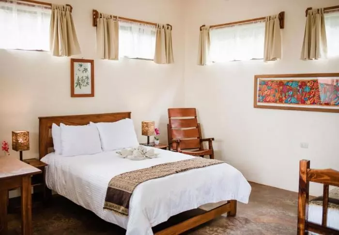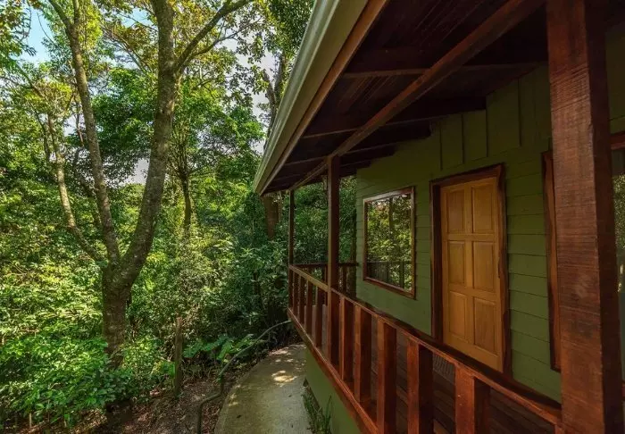 Its rooms are primarily made of wood and decorated in natural colours with green hues. All rooms have air conditioning, cable TV and a mini fridge as well as an en suite bathroom with a hair dryer. Each room also has its own small covered veranda with a couple of chairs where you can relax and enjoy the lush surroundings – and perhaps even spot a colourful butterfly or a hummingbird.