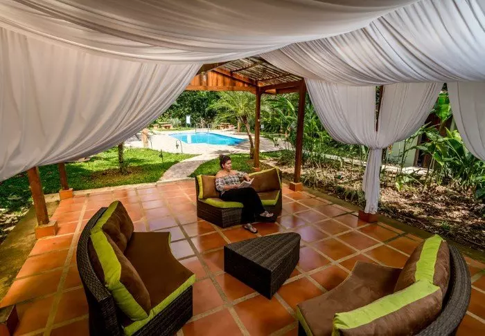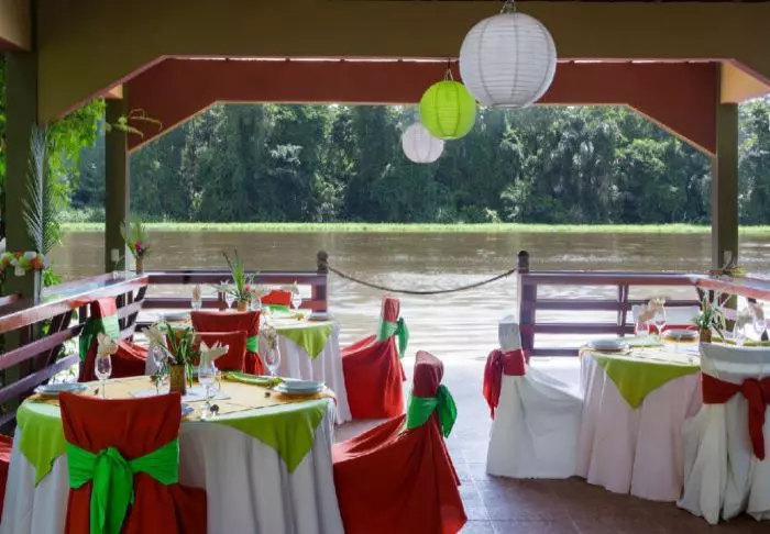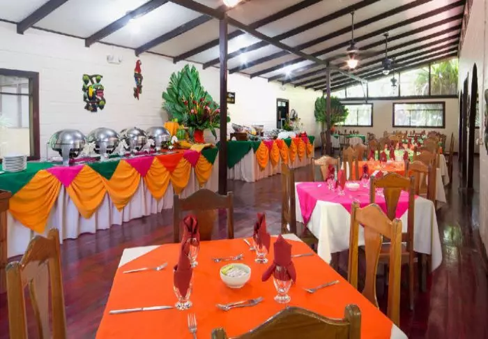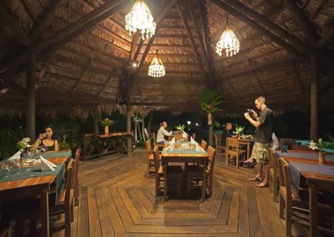 Its eight pleasant bungalows are located on small hills in the middle of the hotel’s hilly landscape and can each accommodate up to 4 people. All have ceiling fans, a safe, mosquito nets over the beds and an en suite bathroom with hair dryers and toiletries. Each bungalow also has a veranda with a couple of hammocks where you can relax after an action-packed day and enjoy the scenic surroundings. You may even be lucky to enough see parrots, toucans, hummingbirds or other exotic birds flying by.