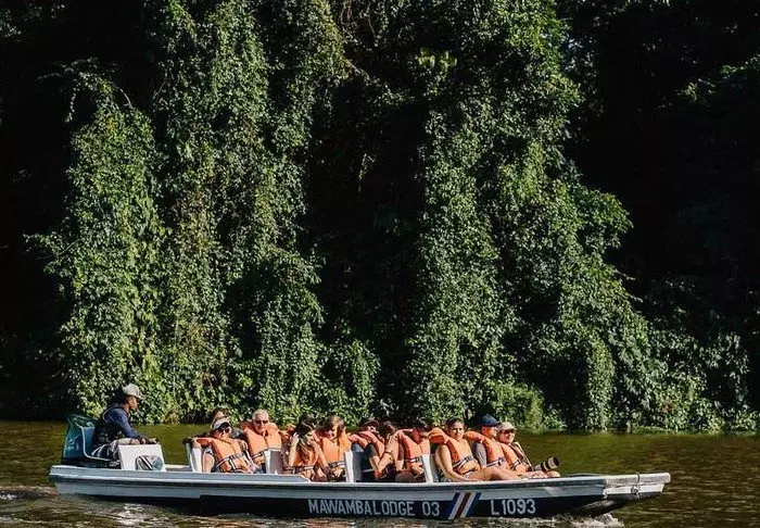The lodge’s 10 bungalows are built of wood and decorated in warm colours with attractive wood panelling on the walls. With two double beds, they can accommodate up to 4 people. They also offer Wi-Fi, cable TV, a fridge, an en suite bathroom with toiletries and a hair dryer, and a small seating area where you can sit and relax. Each bungalow also has a veranda where you can sit and enjoy the lush surroundings.
