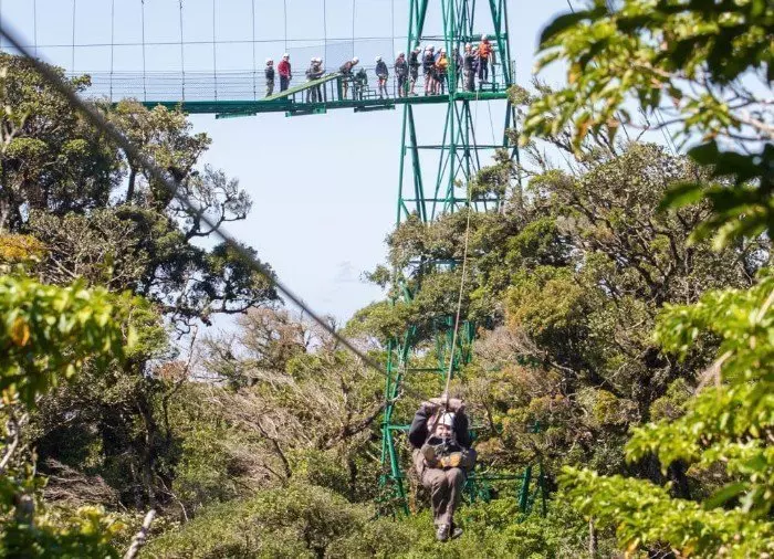 After the hanging bridges, you glide in an open gondola up the hillside and over the tree tops until you reach the highest point of the mountain, where you will be dropped off at a vantage point offering a fantastic view of the magical forest. Then your thrilling ziplining adventure begins!