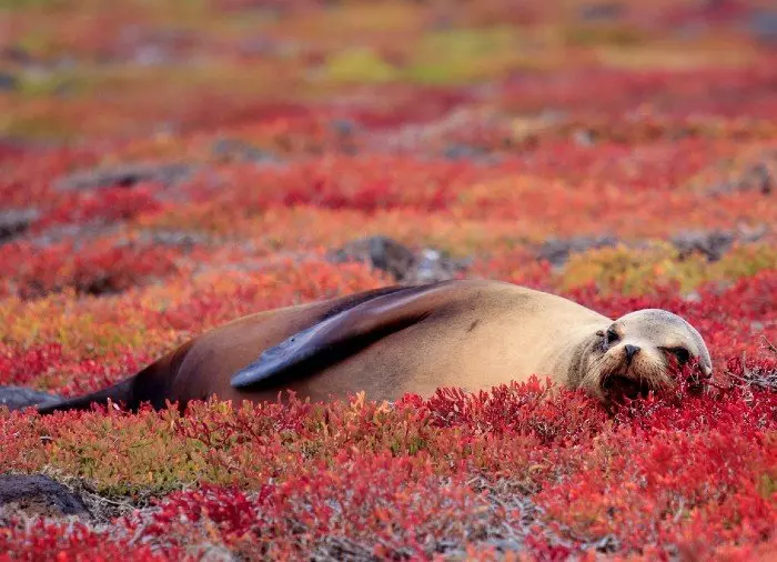 Pretty much wherever you look on South Plaza, you will be able to see fig cacti as well as the plant sesuvium edmonstonei, which can only be found on Galapagos. The island is also home to land iguanas, and you might be able to spot one waiting in the shade of a fig cactus for its fruit to fall to the ground. At the water’s edge, you are in with a chance of seeing sea lions and seabirds such as dovetail gulls and red-billed tropicbirds.