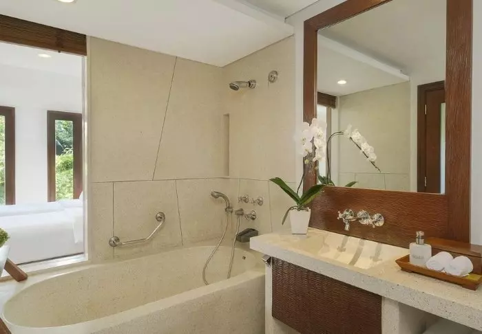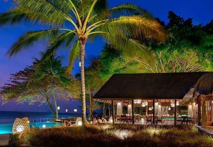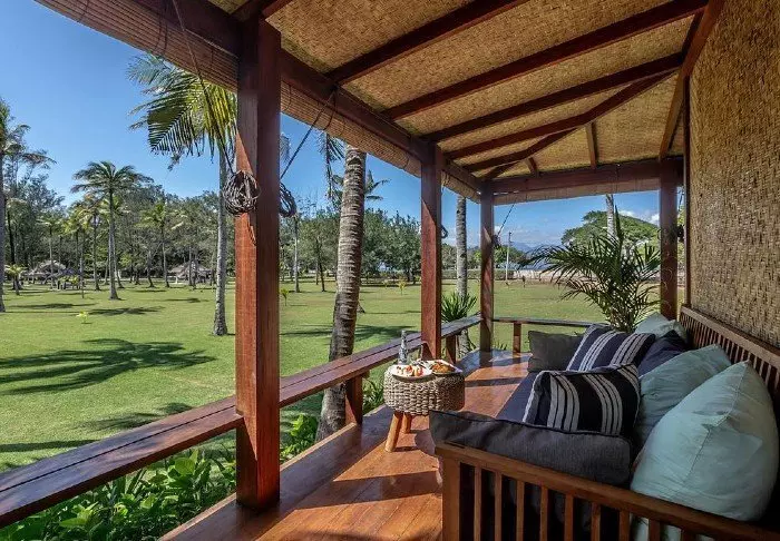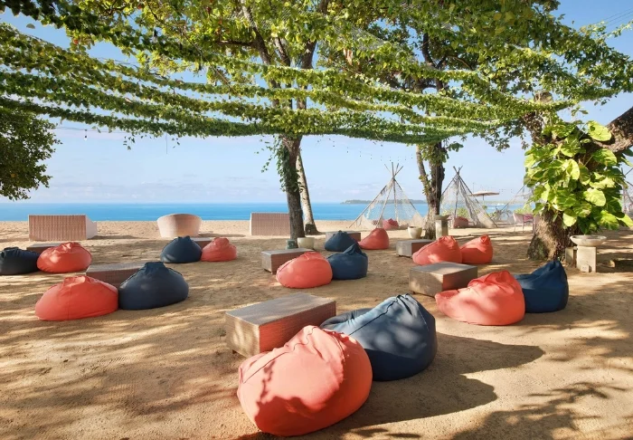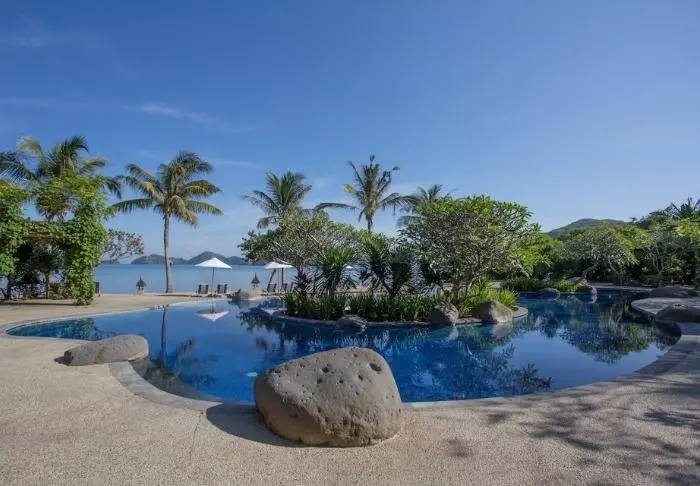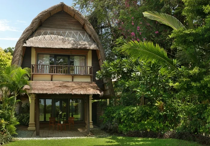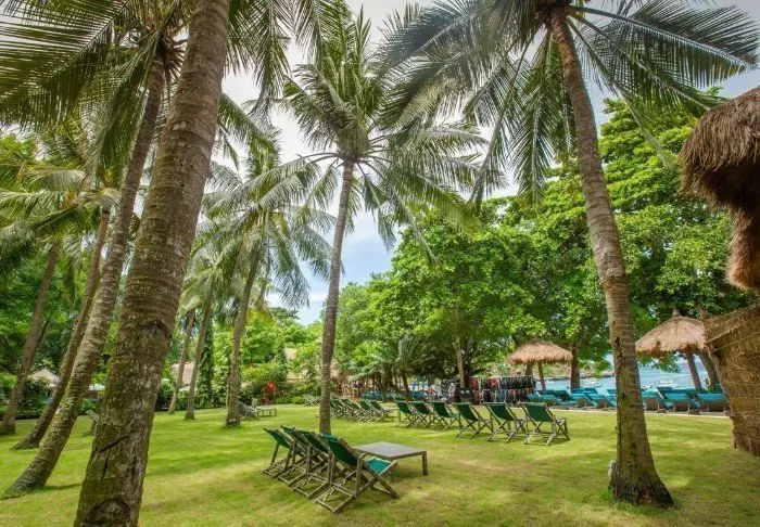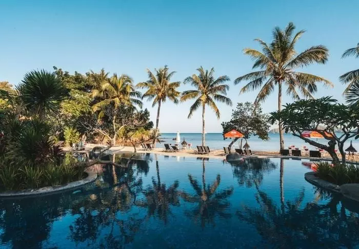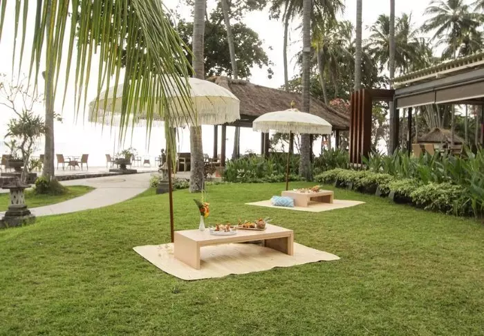 The resort stands out for its elegant and harmonious style, which beautifully complements the scenic surroundings. Surrounded by lush, tropical gardens, the place creates a calming atmosphere with the sound of lapping waves and birdsong, contributing to a charming and relaxing environment.