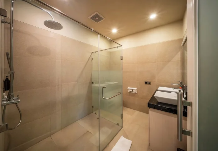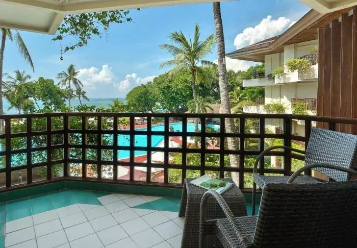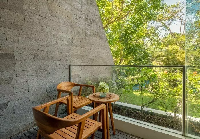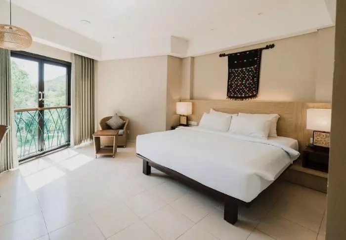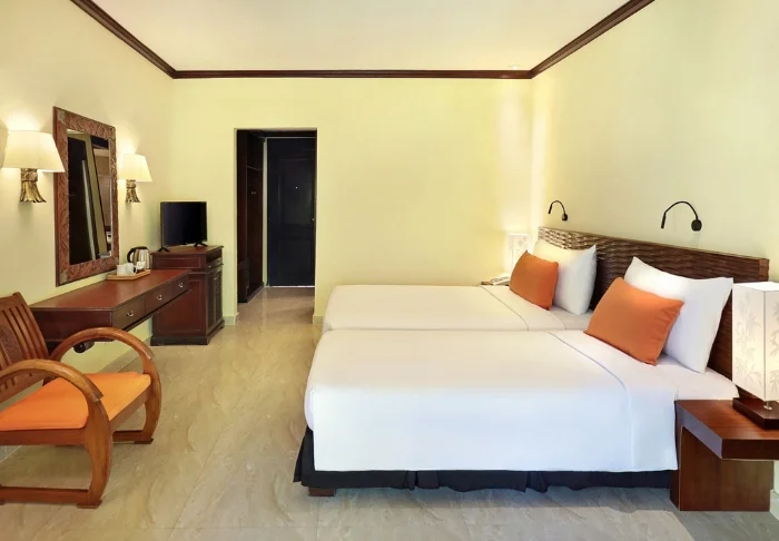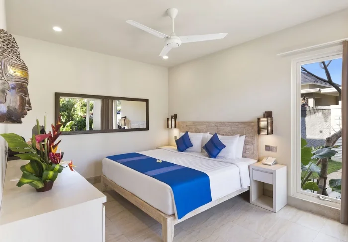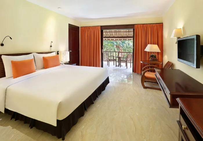 You’ll be staying in one of the hotel’s standard deluxe rooms, housed in low-rise buildings scattered across the resort. Each room is 40 m² and features either a king-size bed or two single beds. The design is minimalist, with dark wooden furniture, tiled flooring, and muted tones, creating a calm atmosphere. All rooms offer air conditioning, a TV, Wi-Fi, a minibar, tea and coffee-making facilities, and a safety box. The bathroom includes a shower and hairdryer. From your spacious private balcony or terrace, you can take in views of the resort’s tropical gardens, full of palms and flowering shrubs. Some rooms interconnect, making them a great choice for families travelling together.
