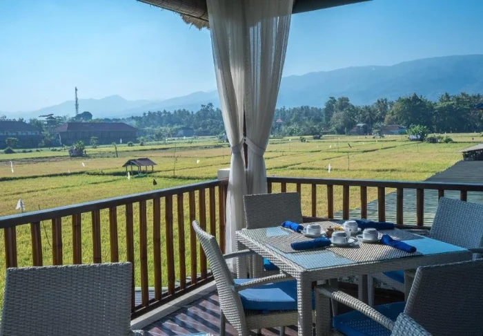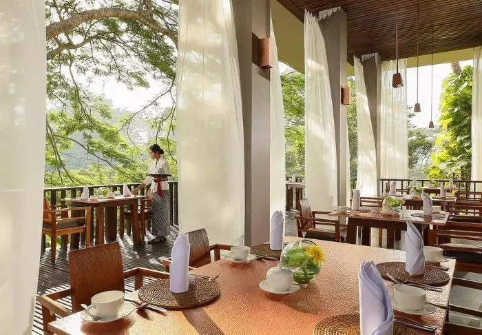 The rooms are spacious and beautifully furnished in light natural materials with private balconies overlooking the mountains, rice fields and the river. All rooms have Wi-Fi, air conditioning, a minibar, a safe, tea and coffee making facilities and mosquito nets over the bed. The bathroom has a bathtub and you will also find bathrobes, slippers, toiletries and a hair dryer in here. To make your stay extra comfortable, 2 complimentary bottles of water and fresh tropical fruits are served daily.