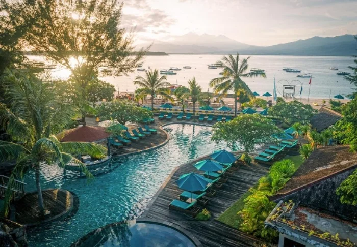 The resort is located right on a lovely beach that invites relaxation. The beach boasts soft, golden sand and calm, clear waters, perfect for a dip or snorkelling. The surrounding palm trees and sea views create a tropical and tranquil atmosphere, where you can enjoy the sun’s rays or find shade under a parasol. The beach is also an ideal spot to witness magical sunsets over the Lombok Strait, painting the sky in warm hues.