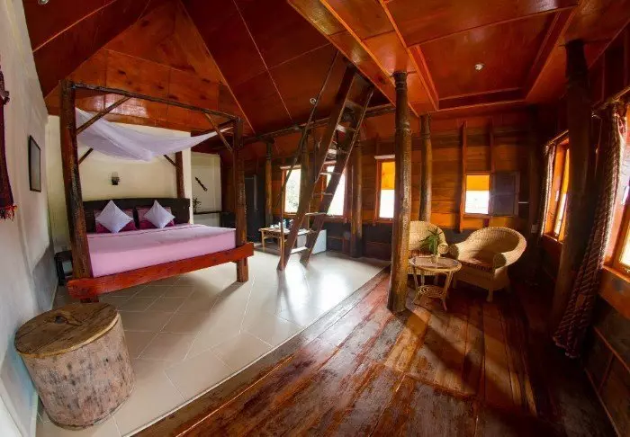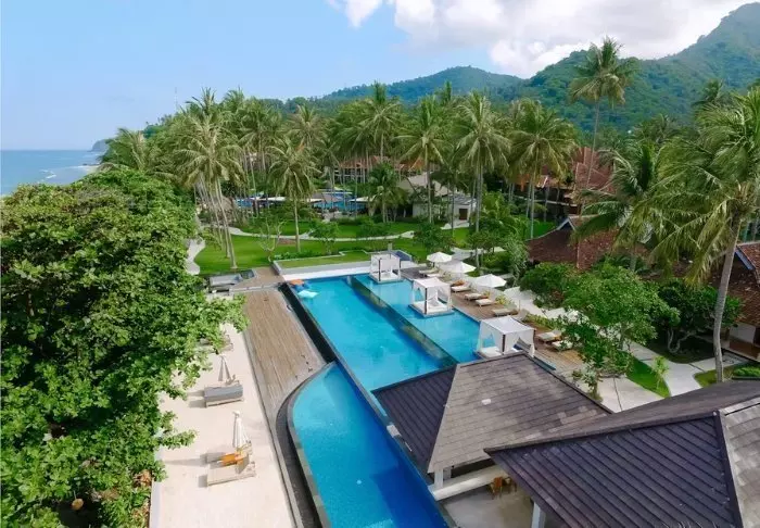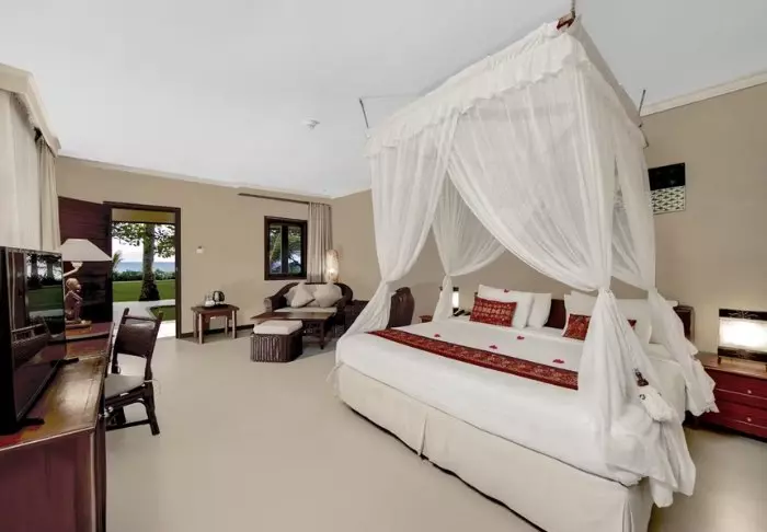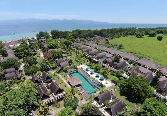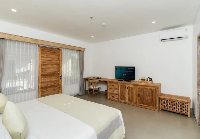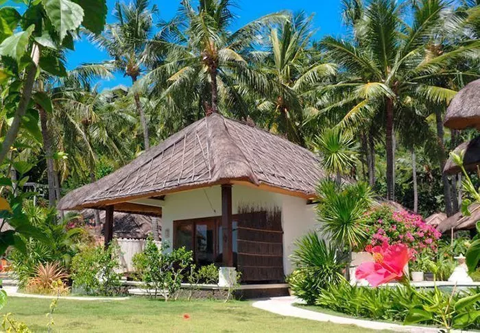 The resort is surrounded by a large tropical garden and is built in traditional Sasak style. All 35 rooms are furnished with beautiful natural materials from floor to ceiling and embellished with beautiful woven fabrics. All offer air conditioning, Wi-Fi, a minibar, free bottled water, a safe, a TV and a DVD player. The bathroom has a rain shower, a hair dryer and complimentary toiletries. From your balcony, you can enjoy the quiet breeze and the view of the garden planted with mango trees and palm trees or the calm waters of the bay.