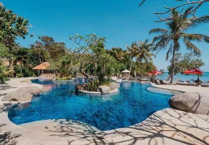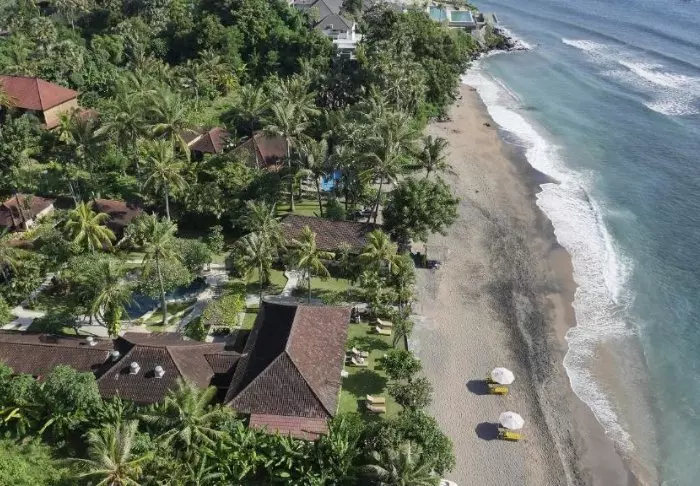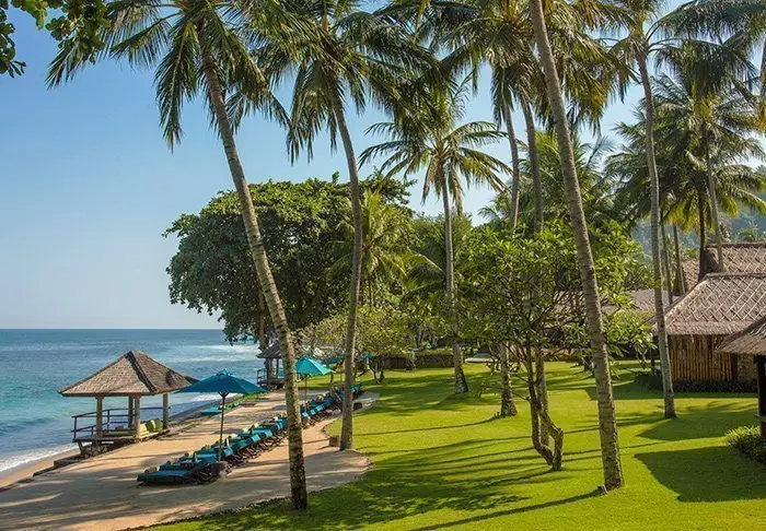Batu Karang Lembongan Resort is located on a coral slope above Jungut Batu Beach, overlooking Badung Strait and the magnificent volcano Mt. Agung in Bali.