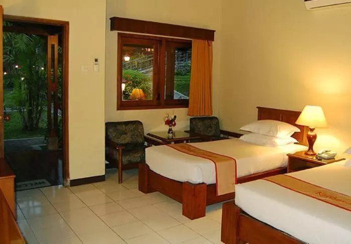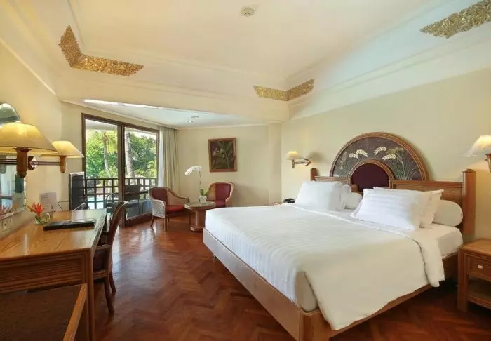 Prama Sanur was built in 1974, but the hotel has since undergone several renovations. The hotel has 428 rooms and suites with views of either the tropical gardens, the pool or the sea. They are decorated in Balinese style with wooden furniture and fine carvings. All rooms are equipped with amenities such as air conditioning, wi-fi, electric kettle for coffee and tea, minibar, safe as well as TV and telephone. The bathrooms are equipped with a shower as well as complimentary toiletries and a hairdryer.