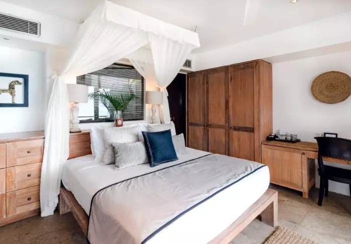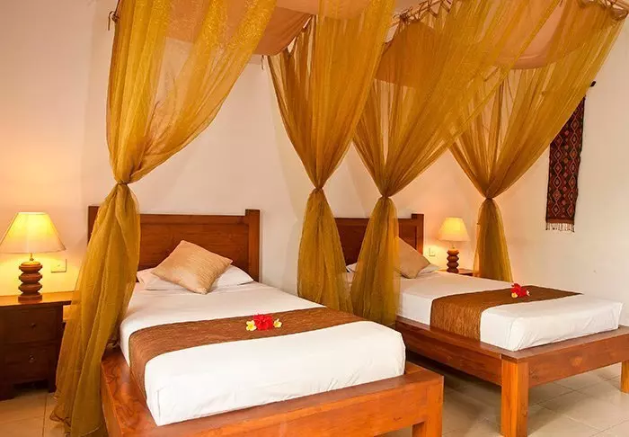 The hotel consists of 18 private bungalows built in a tropical style from natural, sustainable materials. All the bungalows feature elegant canopy beds with mosquito nets as well as Wi-Fi, air conditioning, a mini-bar, tea and coffee facilities as well as a partially open bathroom with a shower, bath robe and hair dryer. On the porch, you can unwind with a good book and enjoy the quiet breeze.