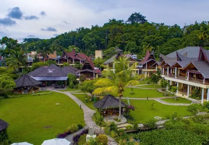 In the rainforest in Gunung Leuser National Park, on the banks of the Bohorok River, stands Bukit Lawang Ecolodge. When the hotel was constructed, the designers drew inspiration from the natural surroundings, and the 34 comfortable rooms are all built of natural materials.