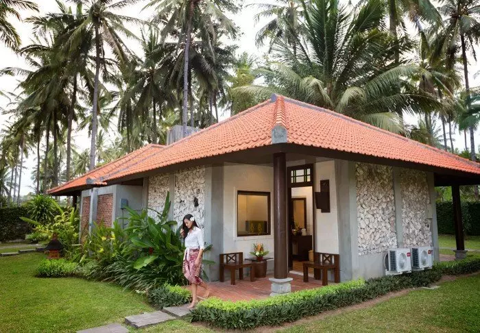 The resort is small and intimate with just 11 rooms in traditional bungalows in a lush garden with tall coconut palms and tropical trees. All rooms are equipped with Wi-Fi, air conditioning, a ceiling fan, a mini bar, a safe, coffee/tea making facilities, a dressing table and a sideboard. The bed is strategically positioned by the large window, allowing you to enjoy the beautiful colours of the sunrise in the sky before you even get up. The rooms have a partially outdoor bathroom with a rain shower and hair dryer. On the terrace, there are sun loungers and a cosy sitting area.