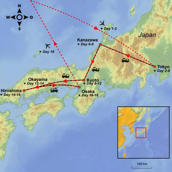 You get Japan to your very core on this big tour. Experience famous highlights like Tokyo, Kyoto, Hiroshima, Kanazawa and Osaka spiced with less famous pearls like Okayama and Naoshima.