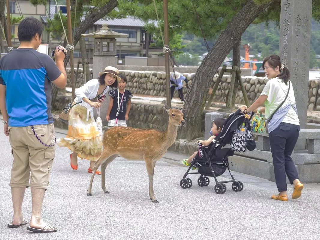We recommend an excursion to Miyajima. Miyajima is less than an hour away from Hiroshima, and is easy to reach to by public transport. Here, stretching about 20 metres up from the water is Miyajima’s world-famous vermilion gate, and at high tide, it appears to float above the surface. When you get off the ferry at the island, whose real name is Itsukushima, you pass by some tourist streets with souvenir shops, small gift delicacy businesses and cafés until you reach the location where you can see the giant gate. On the way, you are sure to encounter the island’s tame sika deer. Also on the island is Daisho-in, a Buddhist temple that is open to visitors. A peculiar trait here is that the Buddha figures are often depicted with scarves and hats on. You can also take the cable car to the top of Mt. Misen, which offers a spectacular view of Hiroshima and the inland sea, which contains over 3000 islets.