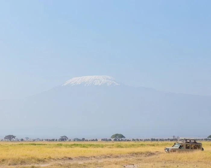In Amboseli National Park, Kilimanjaro rises majestically above the otherwise pancake-flat landscape, as elephants amble past, kicking up clouds of dust behind them.