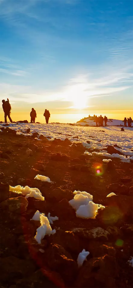 Around midnight, you will be woken up and served a snack before starting the final section of your ascent to the summit – in pitch darkness. Most people consider the difficult terrain you have to traverse on the 6-hour hike to Stella Point the biggest challenge of the entire trip. The aim is to reach Stella Point shortly after sunrise so that you can admire the sight of the blood-red sun rising gently above the horizon. You are not given long to rest, however, because otherwise it would be almost impossible to shake off the cold and fatigue and continue along the rim of the crater to Uhuru. The last stretch of the climb features an even incline. Depending on the season, you may encounter snow on the last part of the route to Uhuru Peak, which is your final goal: the top of Kilimanjaro and the highest point in Africa. Once you reach the peak at an altitude of 5,895 masl, you can give yourself a pat on the back, enjoy the magnificent view and have your picture taken in front of the Uhuru Peak sign as a lasting souvenir of your achievement.