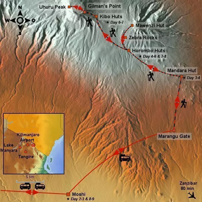 Heights: Moshi: 915 AMSL., Marangu Gate: 1,860 AMSL., Mandaru Huts: 2,740 AMSL.