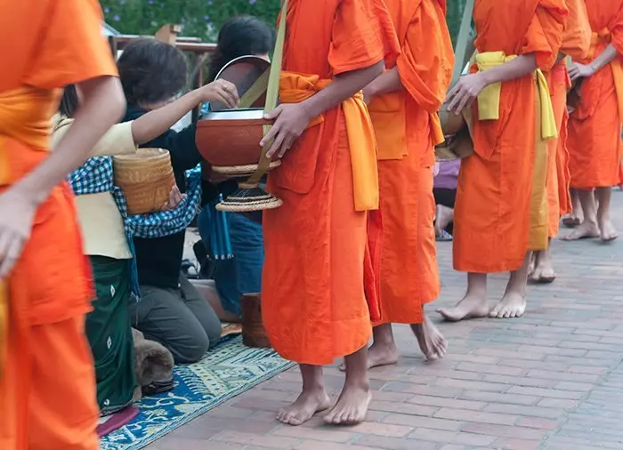 In the early morning hours, when the bells ring at the temples, you will witness a very special daily event in Luang Prabang. Every day, more than 300 monks make their way silently in the fresh morning air through the city streets to collect rice and other food they receive in alms from the locals in their distinctive bronze bowls. The ritual is a tradition when the monks ask for food to demonstrate their humility. Almsgiving is an important religious act in Buddhism and must be conducted respectfully by locals and tourists alike. If you would like to participate in the almsgiving, the guide will show you the best way to do it.