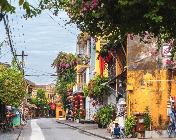 Away from the river, a charming maze of narrow streets unfolds before you. Here, you’ll discover a vibrant blend of Japanese timber houses, Chinese assembly halls, elegant French colonial buildings, and the iconic merchant’s homes. Colourful lanterns drape across the streets like garlands, casting a magical atmosphere, especially as evening draws in. Shops, street food stalls, cosy cafés, and inviting little restaurants are strung along the streets like pearls, enticing you to relax or indulge your curiosity with new discoveries.