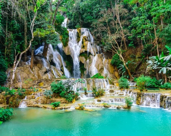 After a lovely lunch, you’ll head 30 kilometres south to visit the Kuang Si Waterfall. Surrounded by lush, tropical jungle, the water tumbles down a steep hillside across three levels. The highest drop is an impressive 60 metres, and at the lowest pool, you can take a dip in the calm, turquoise-blue waters.