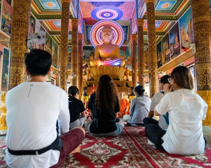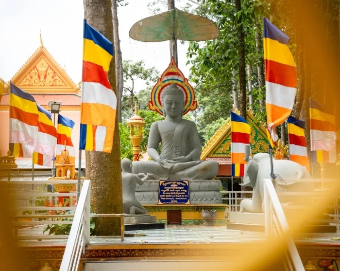 You’ll be collected from your hotel in Cai Be and driven to the tranquil Ba Om Lake in Tra Vinh, a captivating town just over a two hours’ drive away. Here, enjoy a peaceful walk around the lake before a traditional tuk tuk whisks you away to Ang Pagoda and the Khmer Museum, offering fascinating insights into the region’s cultural and spiritual heritage.