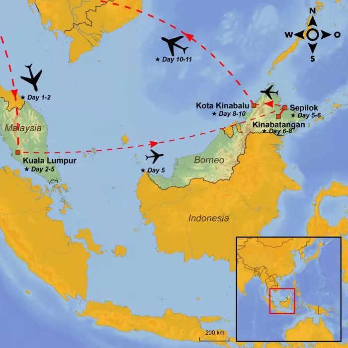 Today, the tour continues as you leave the sights of Kuala Lumpur behind and fly onwards to the world’s third largest island, Borneo. The island is predominantly Indonesian in the south, while the small country of Brunei sits between the two Malaysian states of Sabah and Sarawak in the north, offering a plethora of spectacular nature and wildlife experiences.