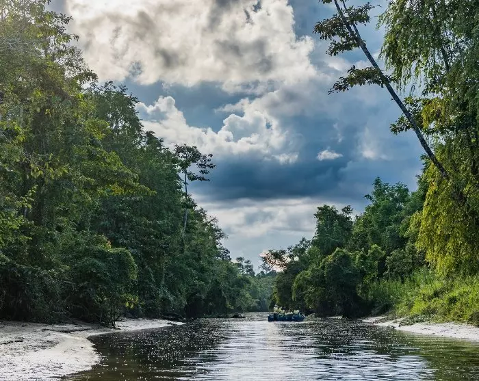 As you step aboard the small boat, recline and soak in the tranquillity of the rainforest, cruising through the sunrise. The surrounding landscape feels like something out of a fairy tale, with vistas that take your breath away. The river meanders through both open and dense rainforest, creating a unique soundscape of roaring monkeys and singing birds.