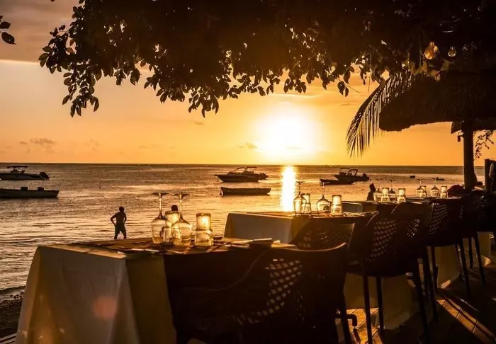 Imagine sitting at a beautifully laid table with your feet in the sand. Shortly, the waiter will bring you the evening menu. In front of you is a cool drink – the condensation forming small beads on the glass. The waves are lapping the beach, and you are looking out at a stunning sunset.