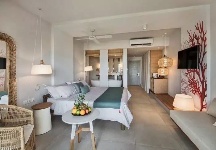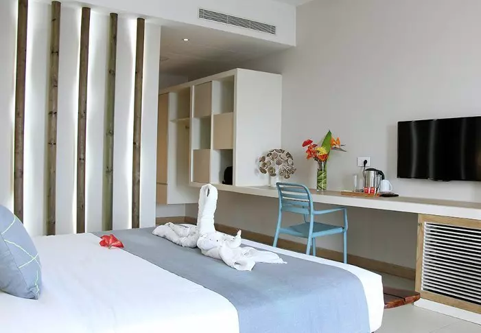 The hotel itself is very charming with its modern colonial style. Green plants, wooden shutters, bamboo furniture and pale colours characterise the interior in both the lobby and restaurant. The long infinity pool is located in the middle of the resort, while the delightful beach bar/restaurant overlooks the beach and cove. Just below the beach bar you will find the ‘boathouse’, where you can borrow kayaks or paddleboards. It is also from here that you can hop on the free water taxi that will take you into the centre of Grand Baie. With your stomachs – or shopping bags – full, you can easily stroll back to the hotel in less than 15 minutes.