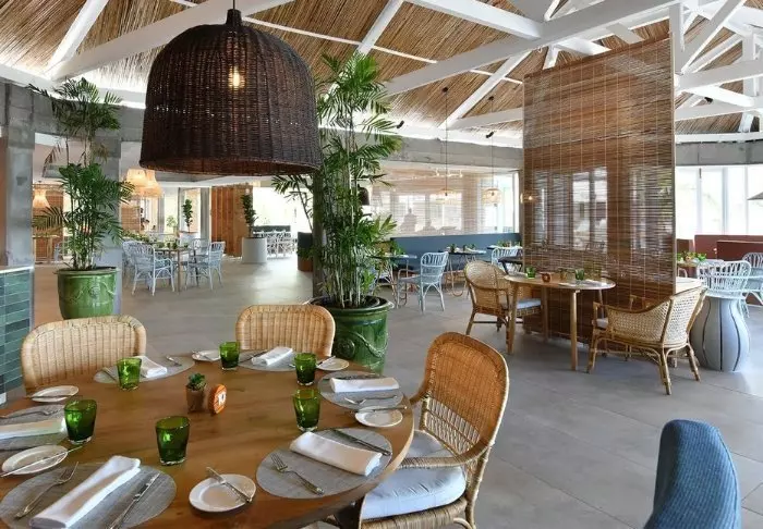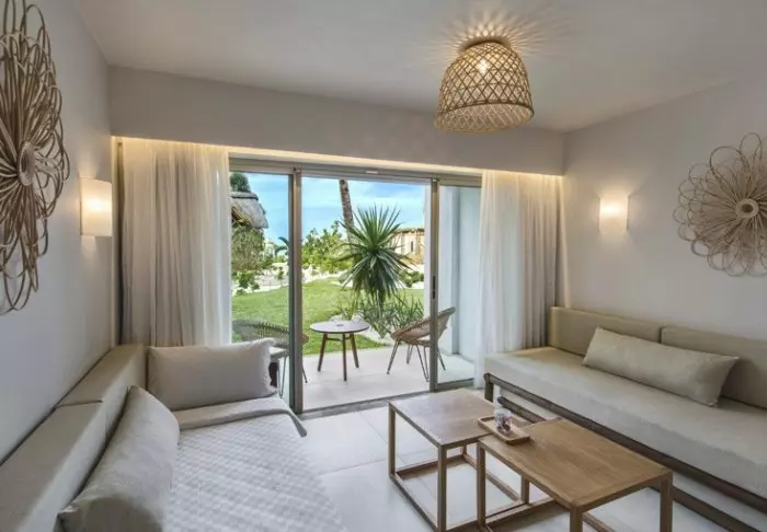 The hotel is located directly next to the chalk-white beach, but if you would rather jump into a pool, there are three of them. The layout of the hotel is quite ingenious: the entire length of the beach has been utilised, so you are never far from either the pool or the sea.