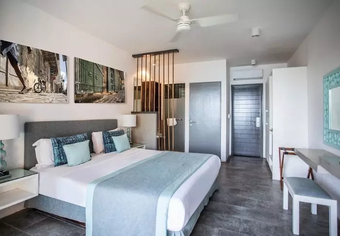 The hotel consists entirely of large deluxe rooms, which all have either a balcony or terrace and are sea facing. All rooms have either a large double bed (king size) or twin beds. Other room amenities include air conditioning, telephone with voice mail, safe, minibar, TV with multiple channels and tea or coffee making facilities.