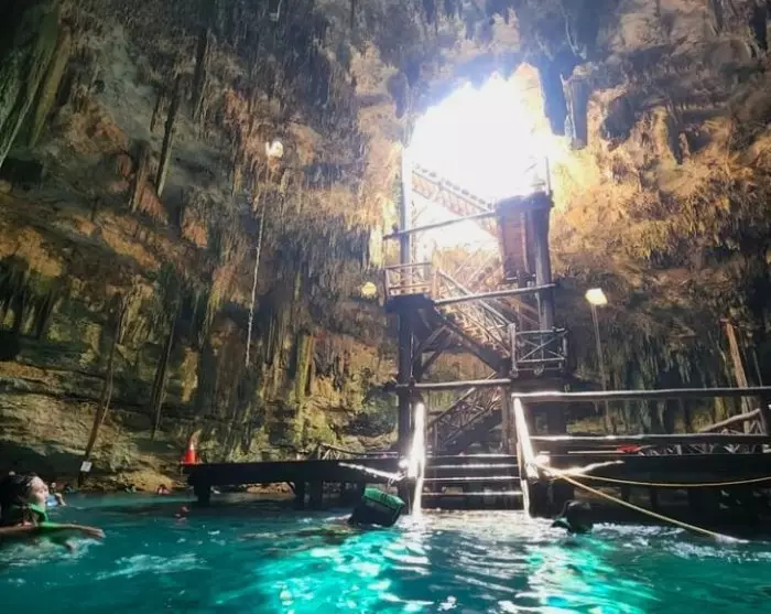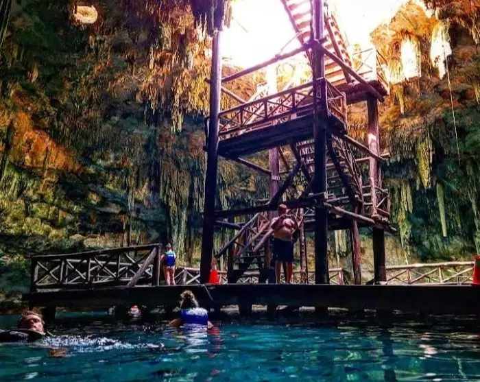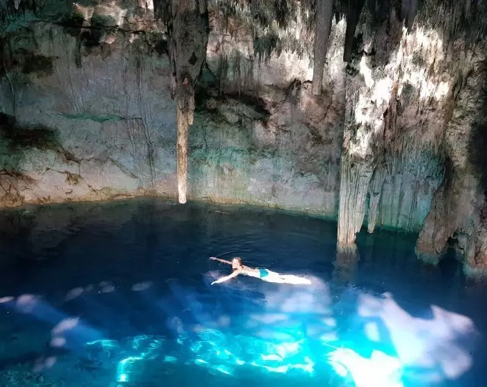 Cenote Chacsikín has a small light hole at the top, from which sunbeams illuminate the clear, azure waters that conceal a depth of approx. 16 metres.