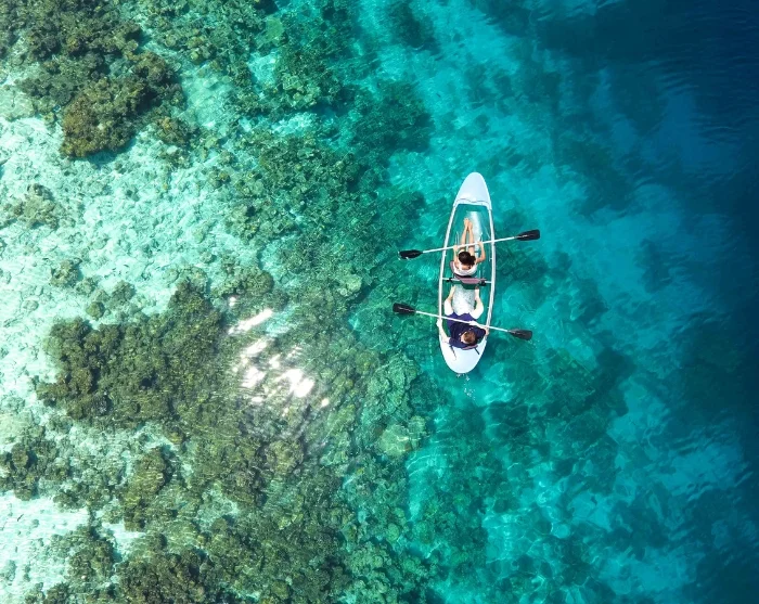This early morning excursion invites you to glide across the crystal-clear waters in a transparent kayak, as the sun slowly rises above the horizon, painting the sky in golden hues.