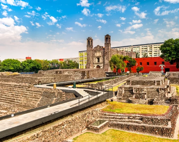 The first stop on the tour is Plaza de las Tres Culturas, or 'Square of the Three Cultures', which symbolises Mexico's three historical periods. Here, you'll find remnants of the pre-Columbian Aztec ruins, a Spanish colonial church, and modern mestizo Mexican buildings, which house the foreign office.
