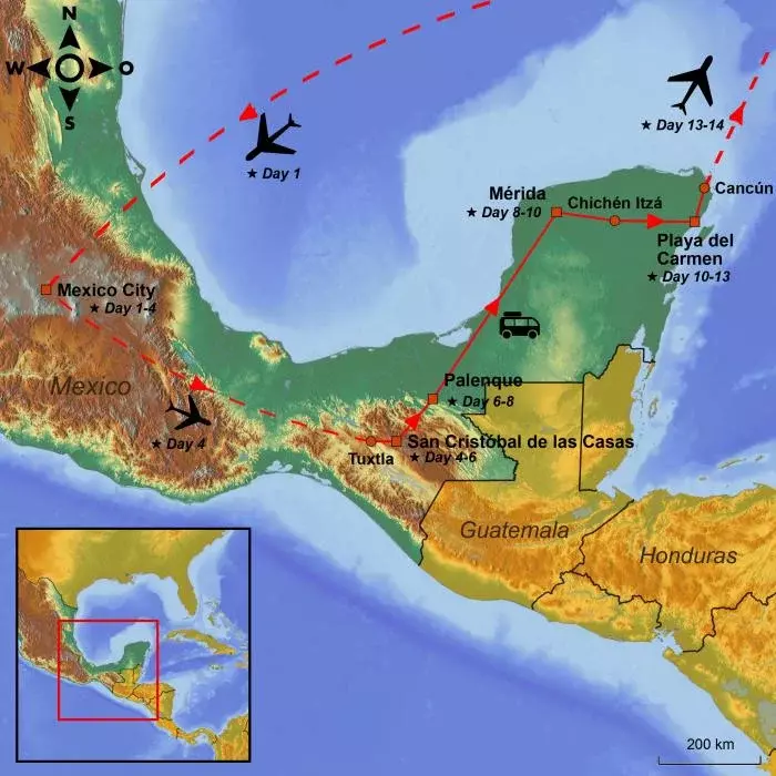 The tour concludes in the holiday paradise of Playa del Carmen with its white sandy beaches, the Caribbean Sea, and time for relaxation under the sun.