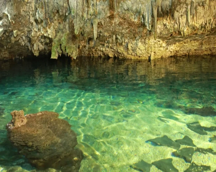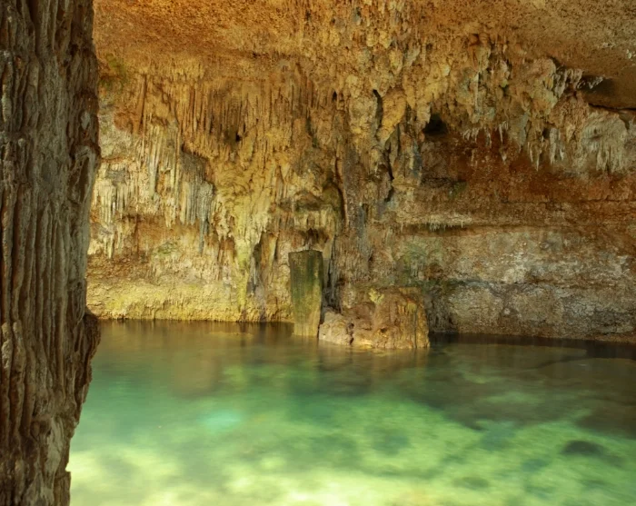After exploring the ruins and enjoying a short lunch stop (lunch is included), your tour continues to the nearby Choo-Ha cenote – an atmospheric underground freshwater cave featuring crystal-clear water and gorgeous stalactite formations. Here, you’ll have time for a refreshing swim in peaceful surroundings. The cenote offers changing rooms with showers, toilet facilities, and the option to hire a life jacket.