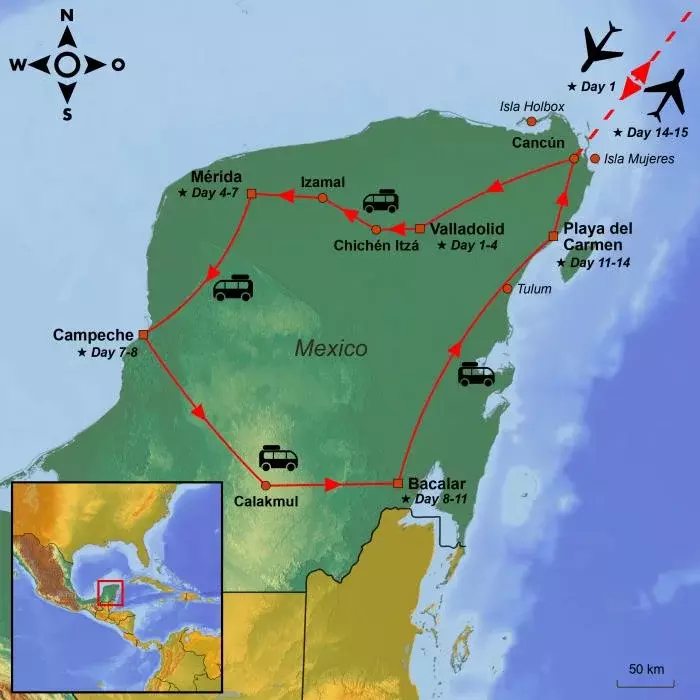 Your journey ends in the beach town of Playa del Carmen, where you can spend your final days unwinding on soft white sands by crystal-clear turquoise waters.