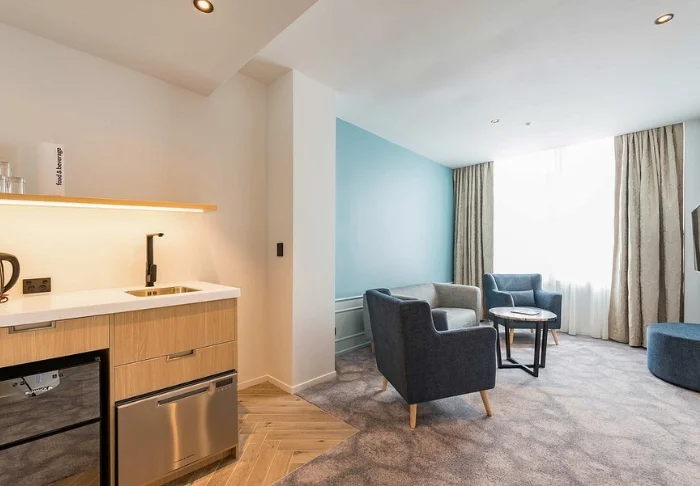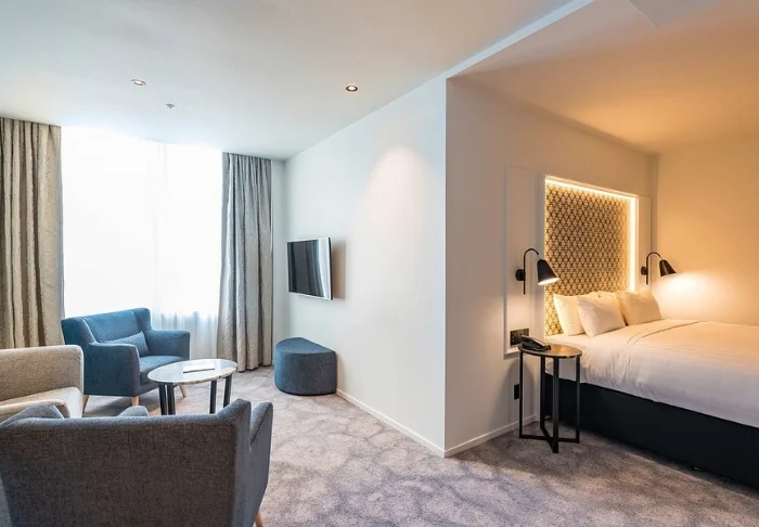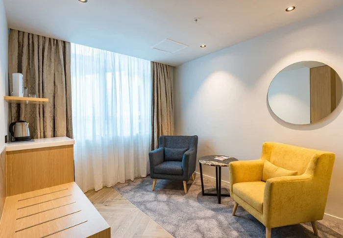 The hotel is stylishly and modernly furnished, with a particular focus on comfort and quality. There are 88 rooms in total, all featuring large windows that let in plenty of natural light. Each room comes with either a king-size bed or two single beds, and is equipped with a private bathroom, air conditioning, a desk, a safety box, ironing facilities, and a Smart TV. Guests also enjoy complimentary Wi-Fi, a kettle, and free tea, coffee, and hot chocolate.